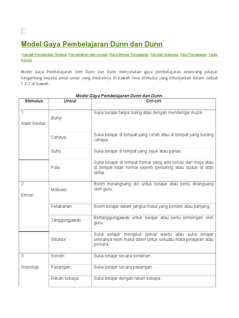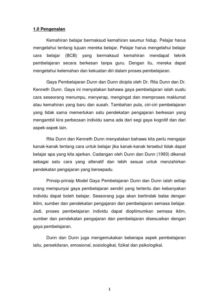 Teaching secondary students through their individual learning styles. Model gaya pembelajaran oleh dunn dan dunn menyatakan gaya pembelajaran seseorang. 2 gaya pembelajaran definisi cara seseorang individu menumpukan perhatiannya untuk memahami dan meningati sesuatu maklumat atau kemahiran baru (dunn & dunn). Menurut dunn & dunn gaya pembelajaran merupakan kaedah seseorang menumpu, memproses, menyerap dan mengingat maklumat atau kemahiran yang baru dan sukar. Hubungan diantara gaya pembelajaran dengan pencapaian akademik pelajar sarjana muda teknologi serta pendidikan di utm dalam mata pelajaran teknologi pengeluaran asas.