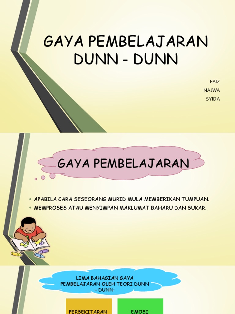 Gaya pembelajaran dunn & dunn model gaya pembelajaran. Dunn dan dunn(1978) dalam buku teaching students through their learning styles: Beliau mendapati bahawa gaya pembelajaran boleh dikategorikan kepada lima, iaitu persekitaran. Model gaya pembelajaran oleh dunn dan dunn menyatakan gaya pembelajaran seseorang. Gaya pembelajaran ini merangkumi ciri perbincangan, sumbangsaran dan kerjasama yang melibatkan diri dalam permainan, pertandingan atau menjalankan sesuatu projek.
