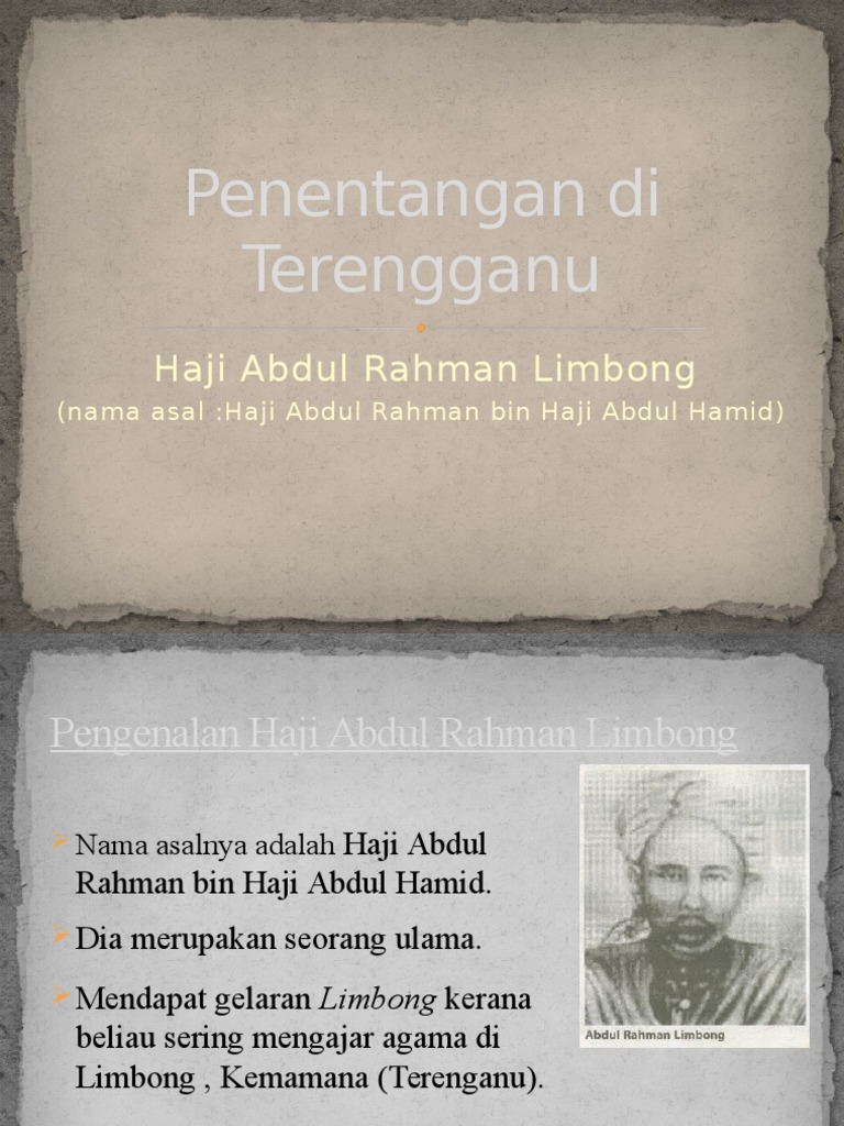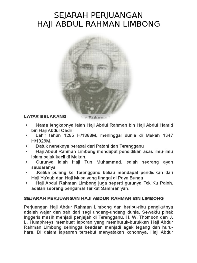 1922'de haji abdul rahman limbong, izinsiz çiftçilik yaptığı için mahkemede yargılanan 43 çiftçiden birini temsil etti. Dalam perkara ini haji abdul rahman limbong disalahkan sebagai orang yang bertanggungjawab menimbulkan pemberontakan dan penentangan ini. Haji abdul rahman bin haji abdul hamid. Haji abdul rahman bin haji abdul hamid (1868—1929) was an ulema, known as haji abdul rahman limbong because he visited limbong, kemaman to teach islam and start trading. Lahir tahun 1285 h/1868m, meninggal dunia di mekah 1347 h/1929m. Haji abdul rahman limbong mengetuai penduduk tempatan membersihkan tanah di kuala telemong tanpa mempedulikan peraturan tanah british. 7.2.1 menyenaraikan tokoh seperti dol said, dato maharajalela, yamtuan antah , rentap, haji abdul rahman limbong, dato bahaman, tok janggut , yamtuan antah objektif menyenaraikan sebab penentangan tokoh tempatan terhadap british. From 1922 until 1928, he was a resistance leader seeking to resist laws and changes introduced by the british. Untuk meredakan suasana yang berlaku. Pengetahuan agamanya yang mendalam adalah satu keistimewaan. Bunu takip eden çok sayıda duruşmada, hiçbir sonuç verilmedi. Terengganu haji abdul rahman limbong ● nama sebenar : Haji abdul rahman limbong yang dilahirkan pada tahun 1868 turut dikenali sebagai tok limbong dan haji derahman limbong merupakan anak setelah beberapa siri penentangan, peristiwa turun naik mahkamah dan tekanan yang diberikan oleh pihak british, haji abdul rahman limbong telah.